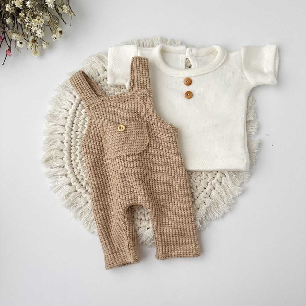 Beżowo-biały komplet ogrodniczki i bluzeczka z miękkich materiałów swetrowych.