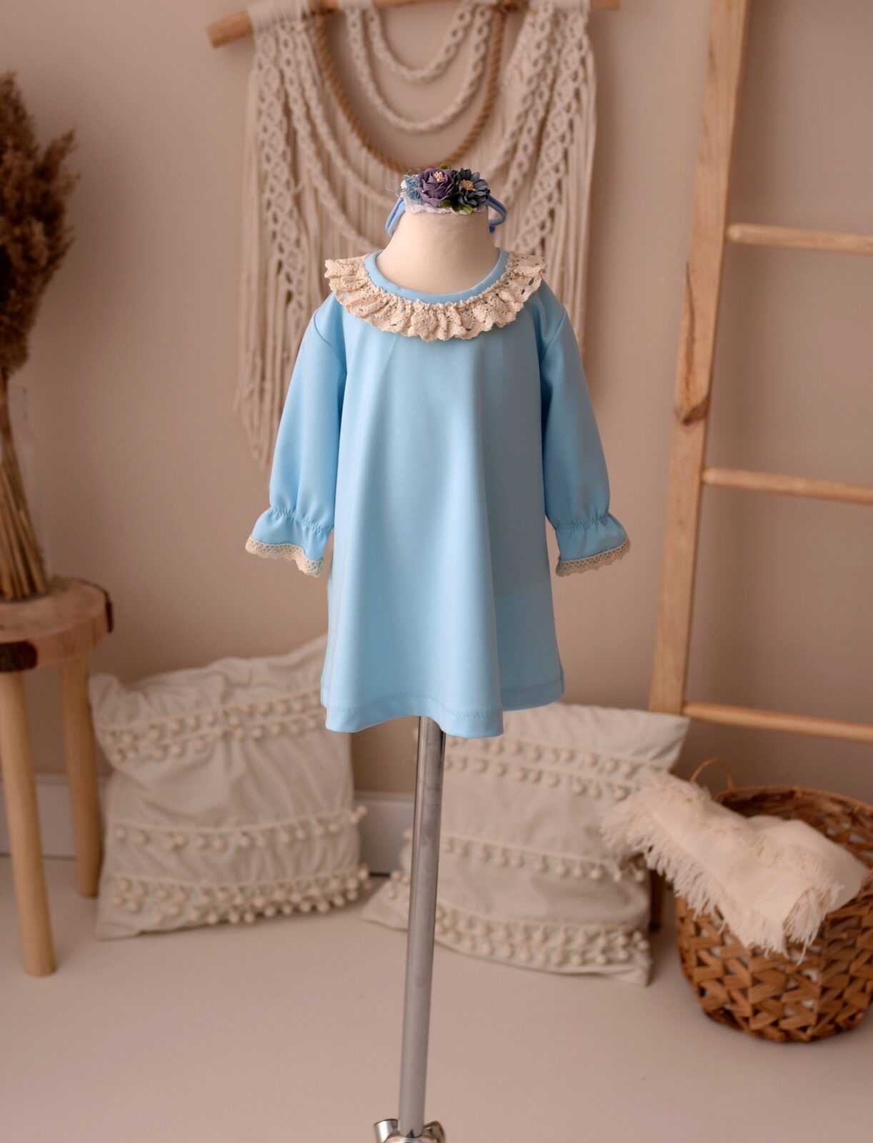 Błękitna sukienka uszyta z dzianiny, wykończona bawełnianą koronką.
