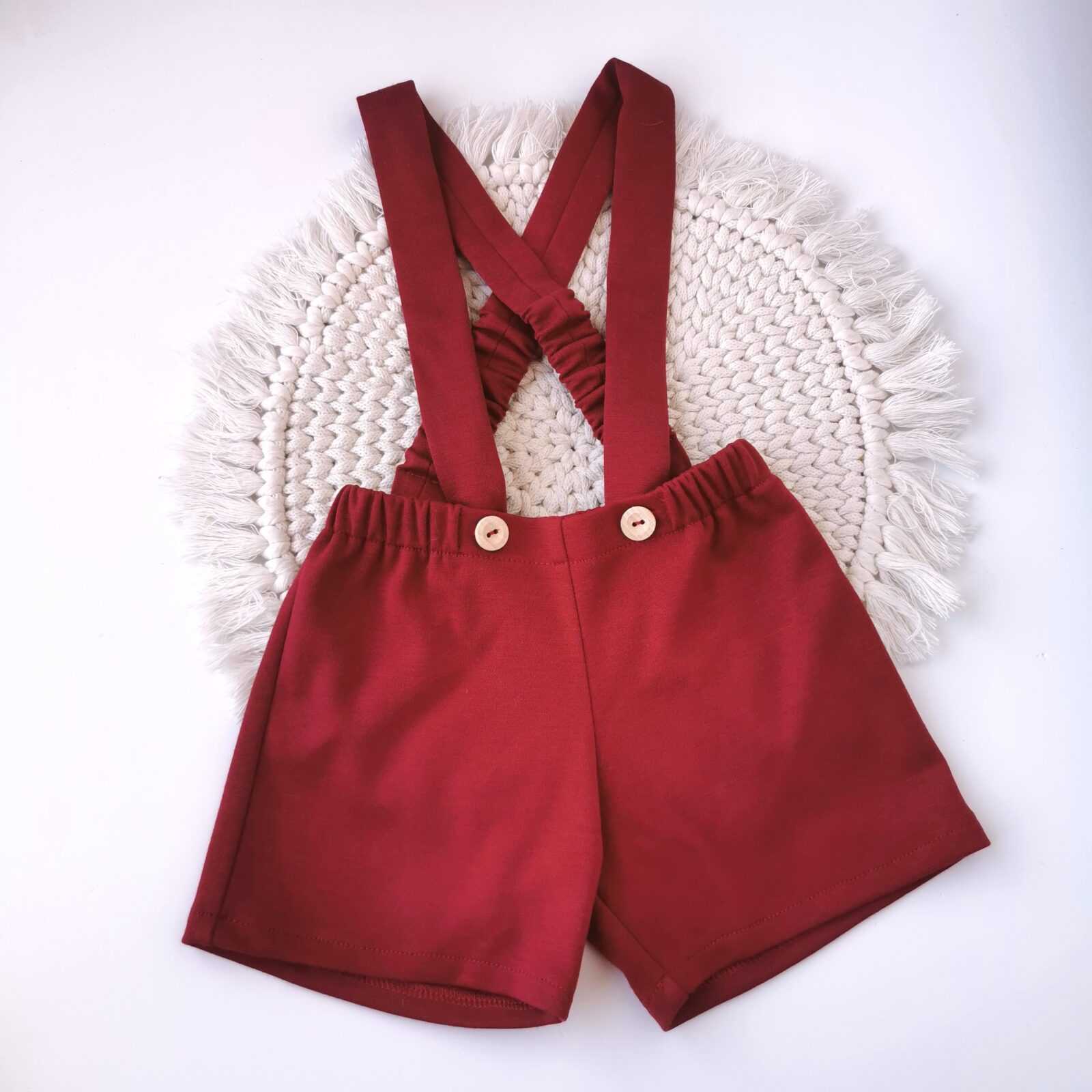 Spodenki na szelkach z elastycznego bordowego materiału.