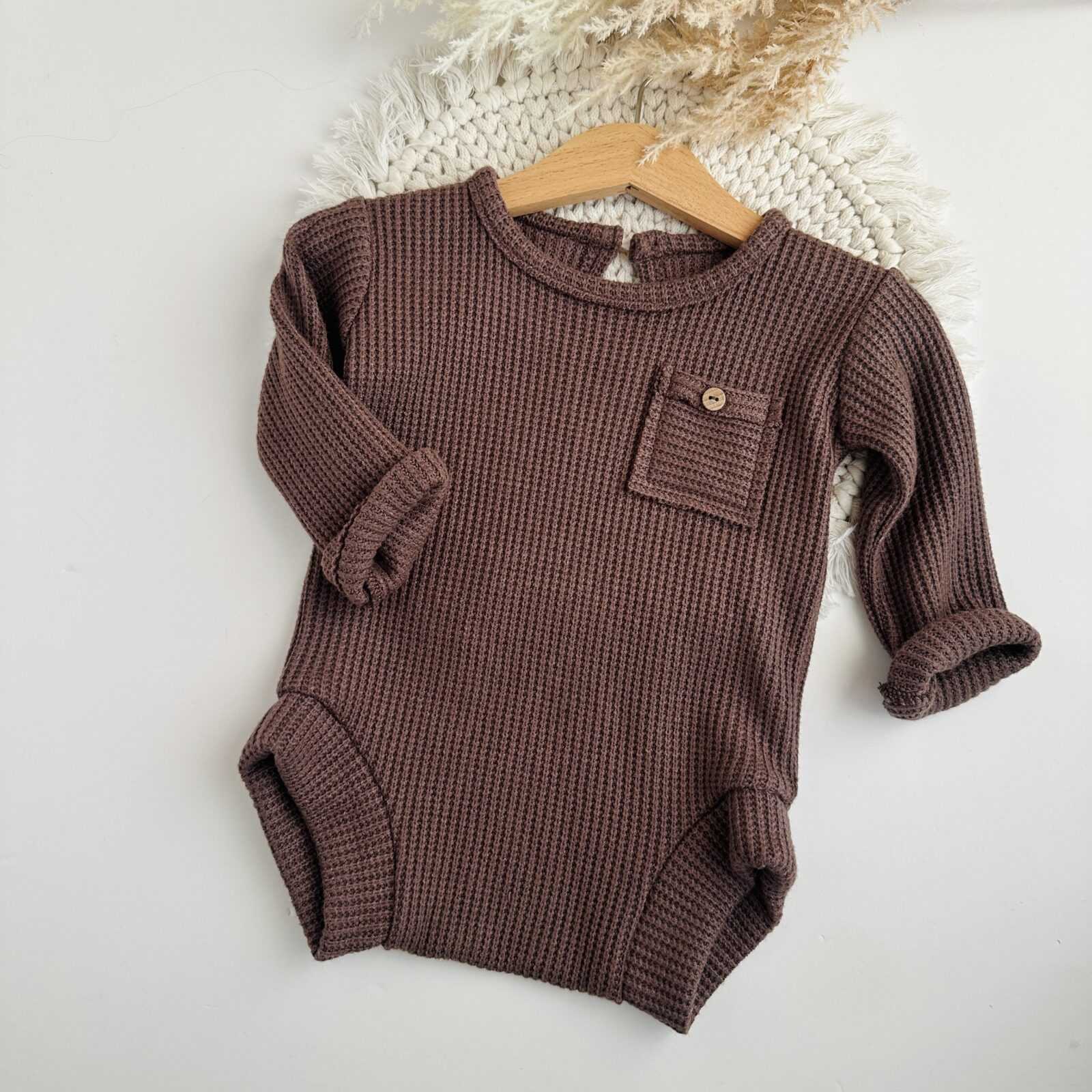 Body dla chłopca z miękkiego materiału swetrowego w kolorze czekoladowym.