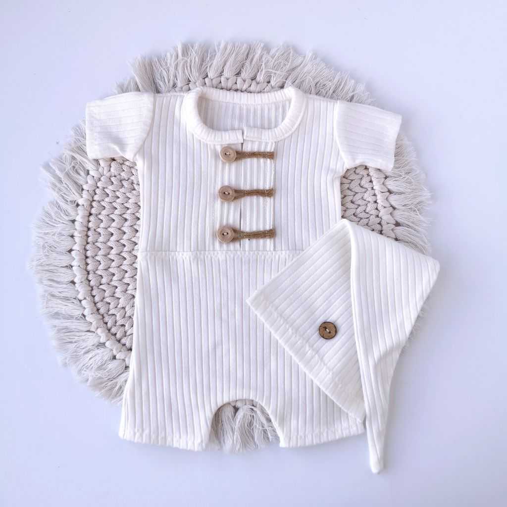 Rampers z czapką z elastycznego materiału w prążki w kolorze ecru.