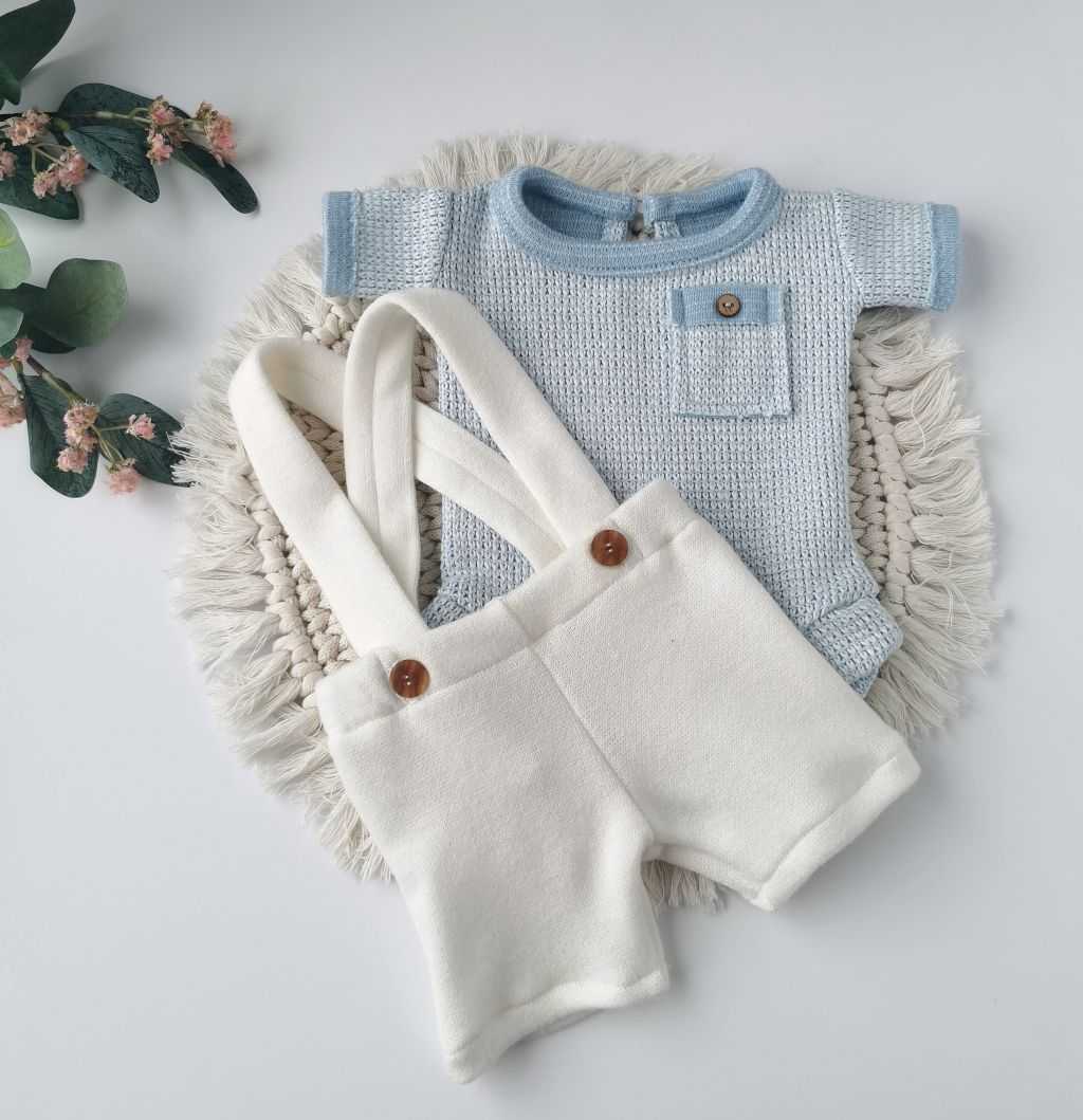 Śmietankowe spodenki na szelkach w komplecie z błękitnymi body z materiału swetrowego.