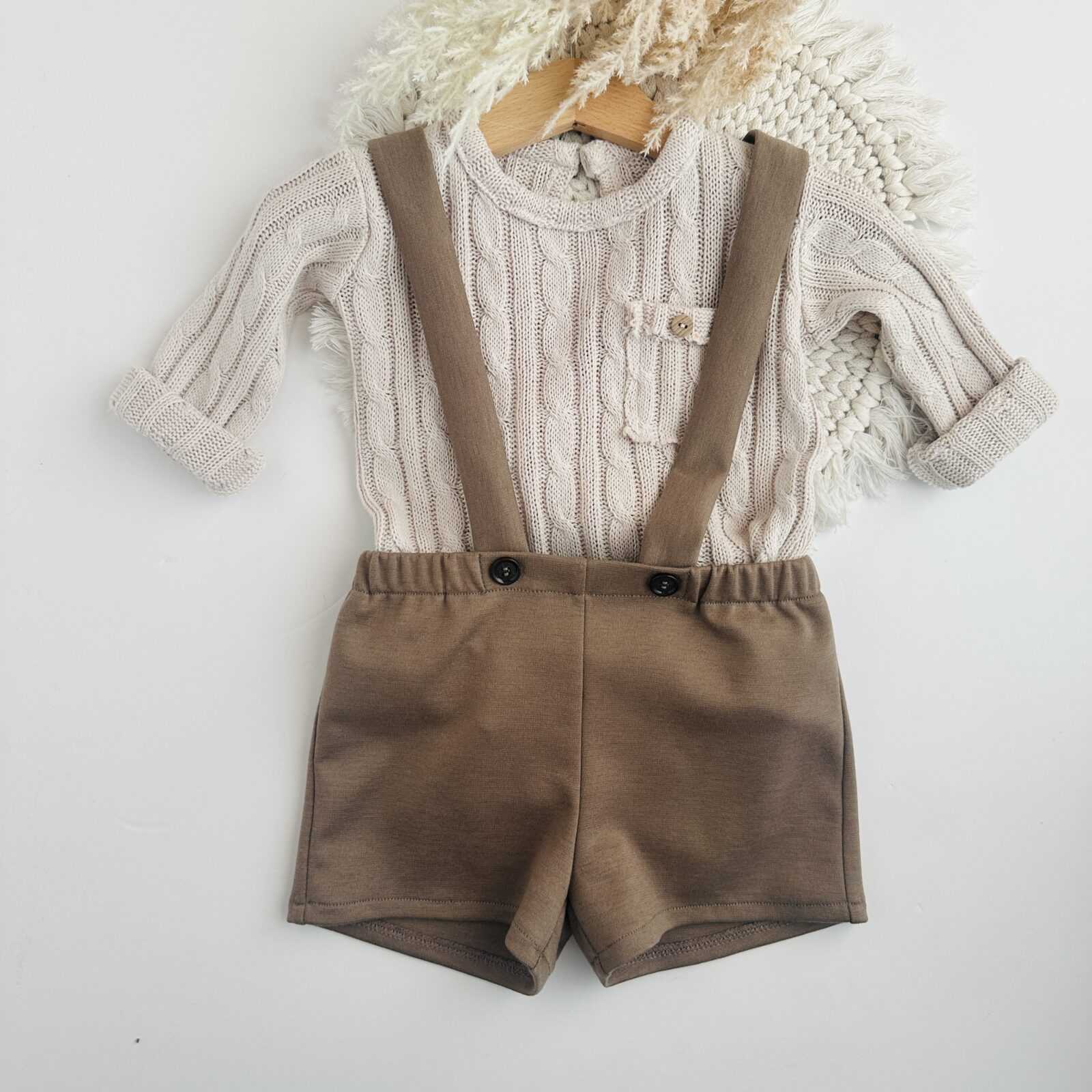 Beżowe body z materiału swetrowego i czekoladowe spodenki na szelkach w rozm. na rok.