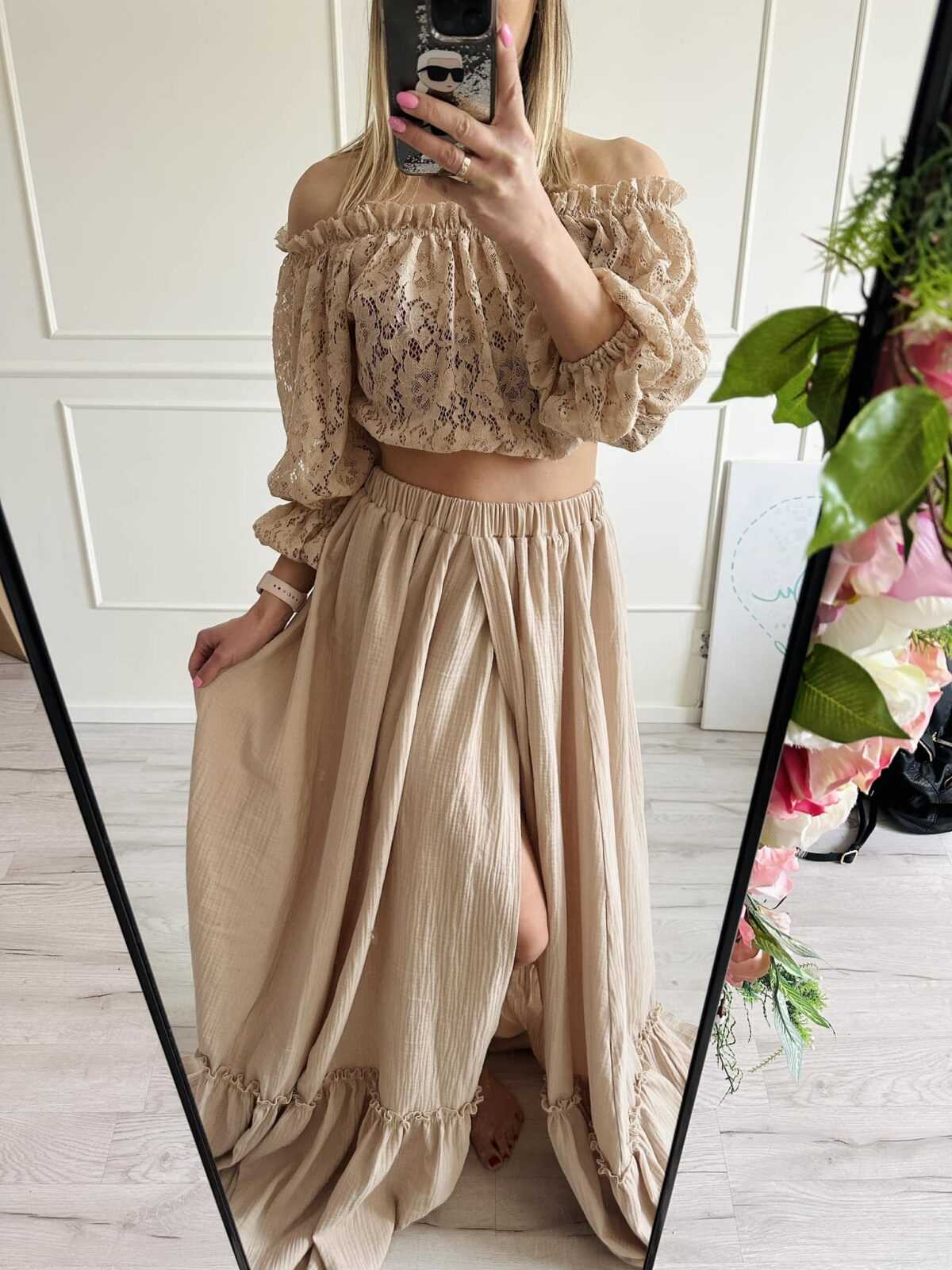 Beżowy komplet, koronkowa bluzka i muślinowa spódnica w rozmiarze uniwersalnym. Do sesji ciążowej jak i kobiecej.