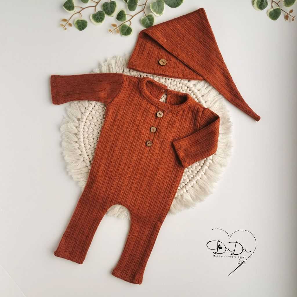 Pajacyk z czapką uszyty z elastycznego, miękkiego materiału swetrowego w kolorze miedzianym.