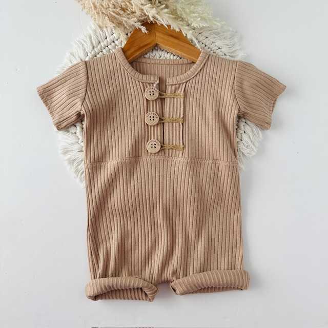 Rampers z elastycznego, beżowego materiału w prążki. Rozm. na roczek.