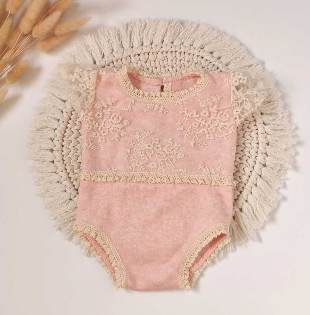 Różowe body z materiału swetrowego wykończone koronkami. Rozmiar na roczek