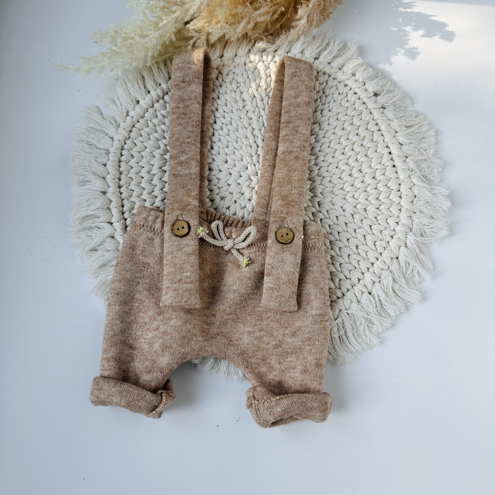 Spodenki na szelkach z miękkiego materiału swetrowego w rozmiarze dla noworodka.