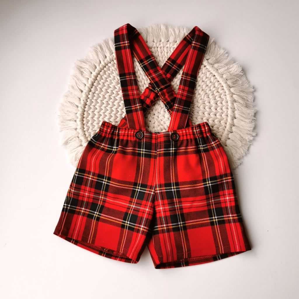 Spodenki w kratkę na szelkach idealne na sesje świąteczne.