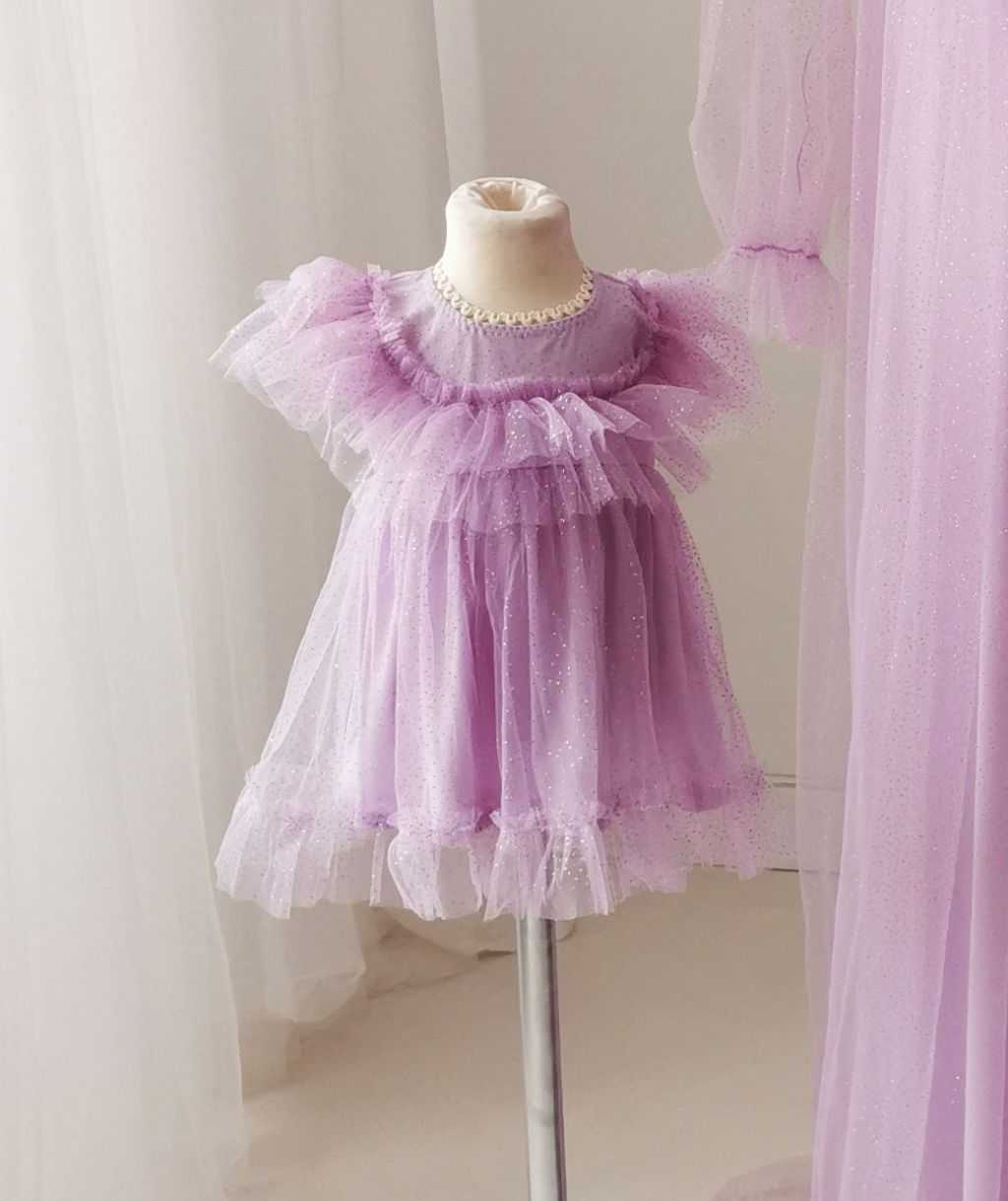Sukienka z pięknego mieniącego się tiulu w kolorze lila.