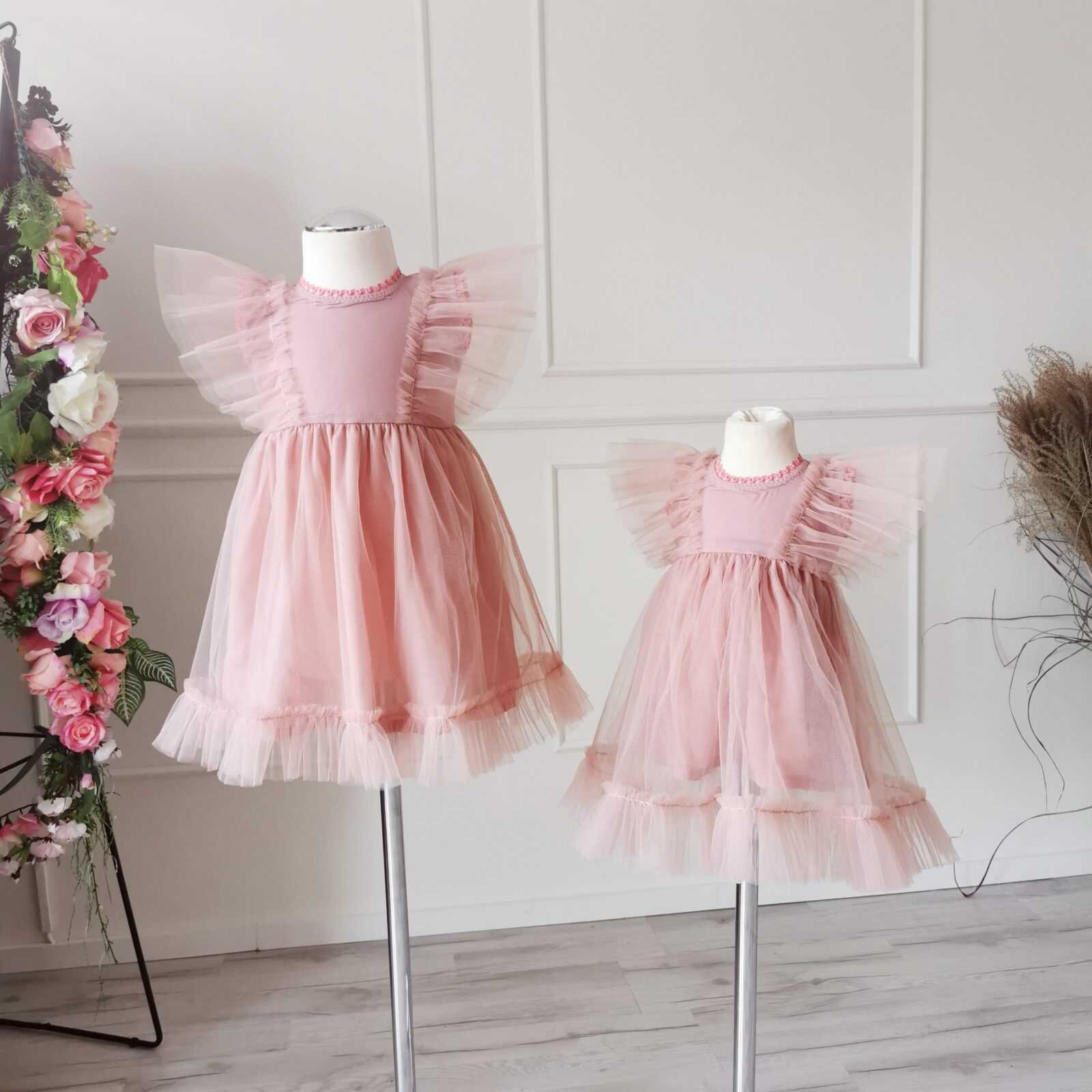 Sukienka tiulowa w kolorze brudny róż w różnych rozmiarach.