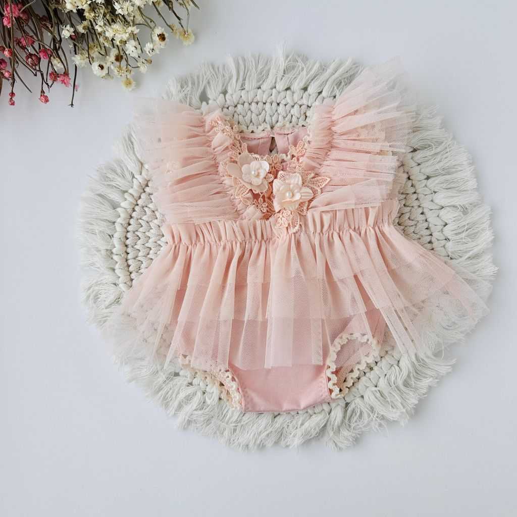 Elastyczne, tiulowe body z aplikacją w kolorze brudny róż w rozmiarze na rok.